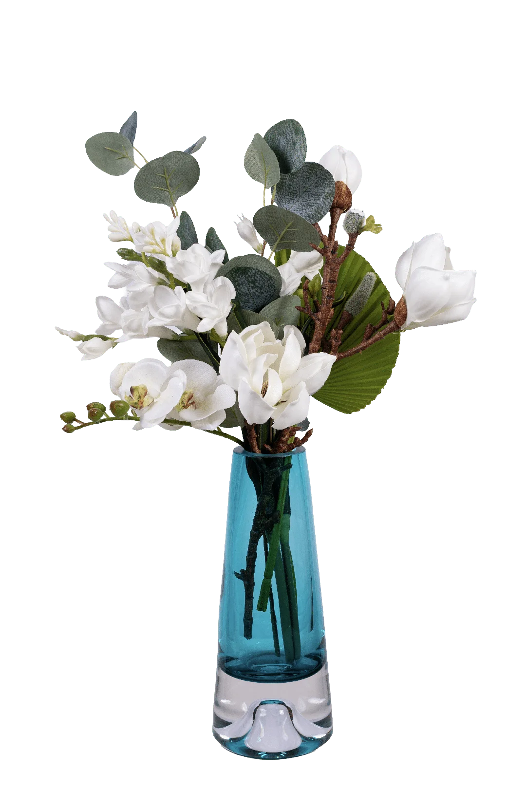 Pure, cool, and deeply considered — Aqua Grace combines white magnolia blooms, delicate white orchids, freesia, dried branch stems, and silvery eucalyptus in a striking tall teal glass vase. A refined, architecturally beautiful arrangement where botanical purity meets a boldly coloured vessel.