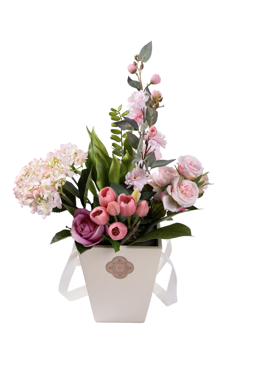 Soft, layered, and full of spring warmth — the It’s a Girl Bouquet brings together blush roses, pink tulips, pale hydrangea, cherry blossom, and deep rose blooms in the iconic Vyne white presentation box. A tenderly composed gifting arrangement of enduring botanical elegance.