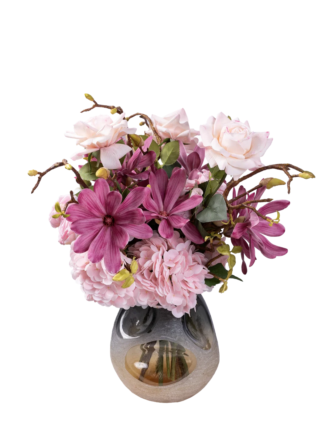 Dreamy, layered, and deeply romantic — Rose Reverie combines pale blush roses, vivid purple magnolia blooms, soft pink hydrangea, and branching budded stems in a beautiful grey-toned globe glass vase. A composition of warmly tonal, romantically beautiful botanical depth.
